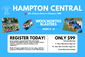 Another reminder Hampton Centrals Master Blaster program starts tomorrow at 9 am, Simpson Reserve. We look forward to seeing familiar faces as well as new arrivals to start their cricket journey! SPOTS are still available for Master Blasters (7-8 year olds). Registration link below: #cheercheer